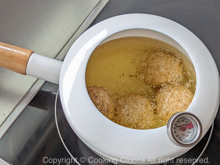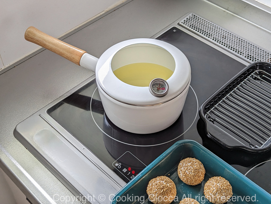 こちらの富士ホーローの天ぷら鍋としても、片手鍋としても使えるホーロー鍋を使って、ごま団子を作ってみました。