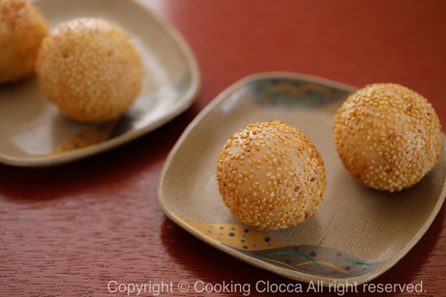 - 丸く形を整えたら、転がしながら白ゴマをまぶします。