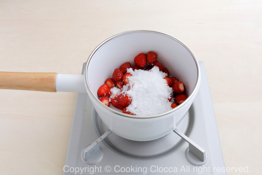 - イチゴと砂糖を鍋に入れ中火で水分をとばします。