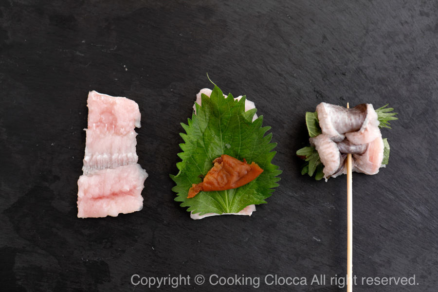 鱧の上に大葉を一枚広げ、梅を少しのせたら巻いて串に刺します。