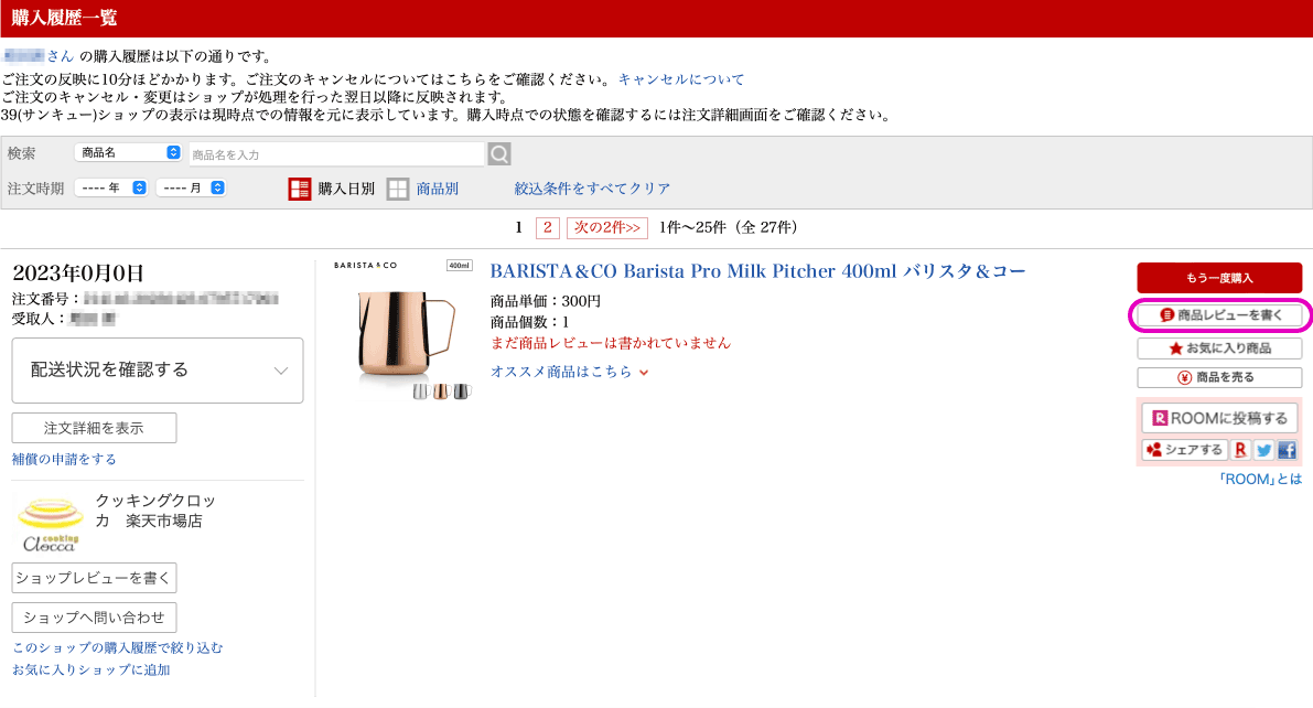 当店で購入した商品の「商品レビューを書く」ボタンをクリックします。