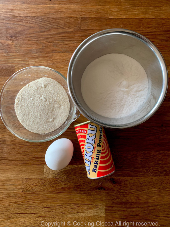 - ボウルに卵、きび糖、サラダ油、ベーキングパウダーを入れ、混ぜる。